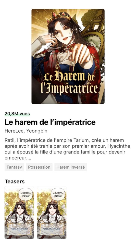Pour les plus pressé.e.s n’hésitez pas à commencer la lecture sur l’application ou la plateforme Webtoon de Naver. Le harem de l’impératrice (하렘의 남자들) y est publié depuis 2020. La série est toujours en cours en Corée avec 200 chapitres et a déjà conquis plusieurs millions de lecteur.ices , alors lancez vous !